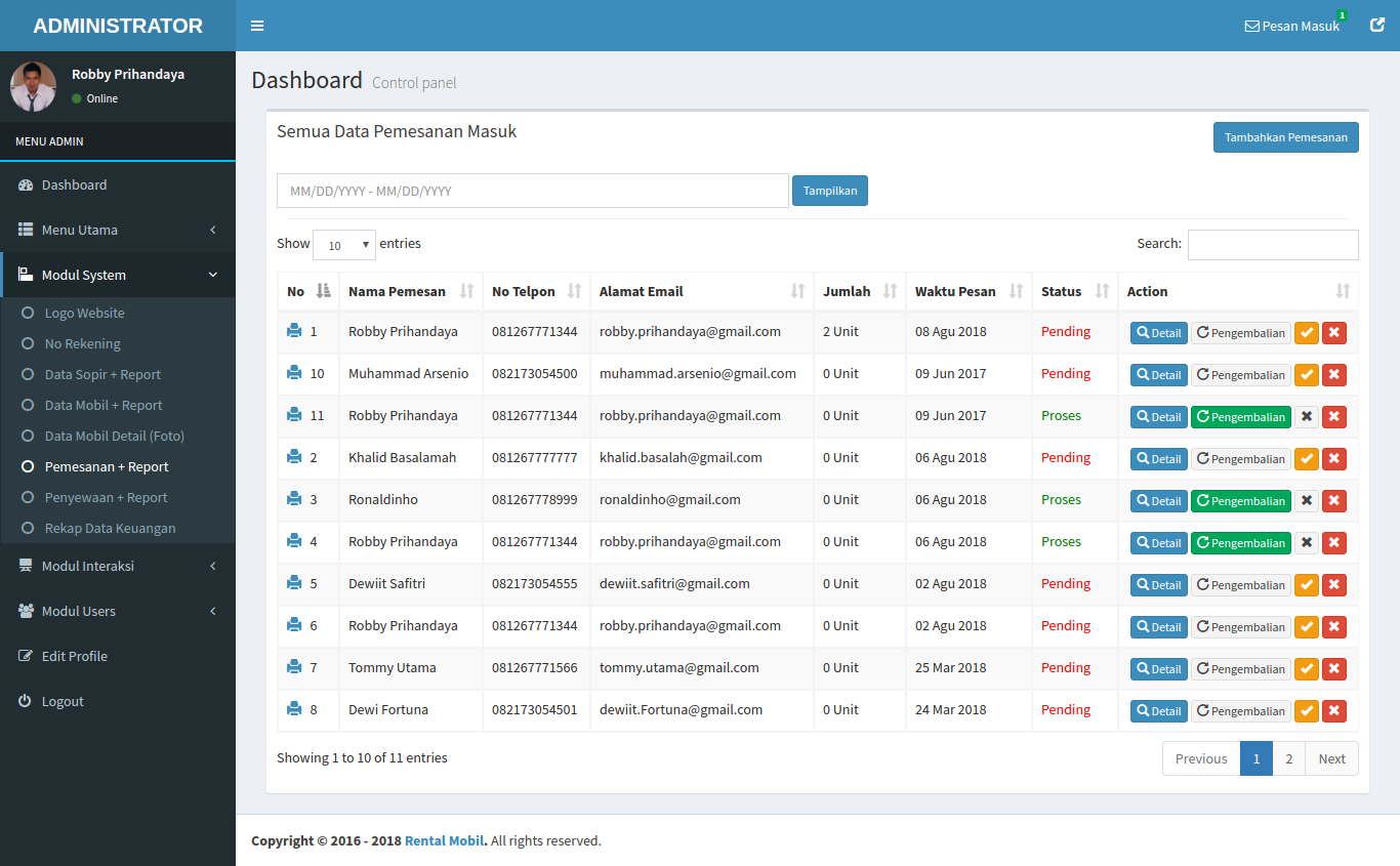 Aplikasi Rental atau penyewaan Mobil Online + Offline seringkali dibutuhkan untuk mempermudah jasa penyewaan Kendaraan, mulai dari mendata kendaraan yang dapat disewakan dan juga untuk mempermudah customer yang mau melakukan booking atau penyewaan secara online. aplikasi ini kita buat dengan menggunakan Codeigniter 3.x database MySQL, jadi akan sangat mudah dikembangkan lagi jika diperlukan khususnya oleh programmer tingkat pemula sekalipun karena untuk codingnya memang sengaja disusun rapi agar mudah dipahami.